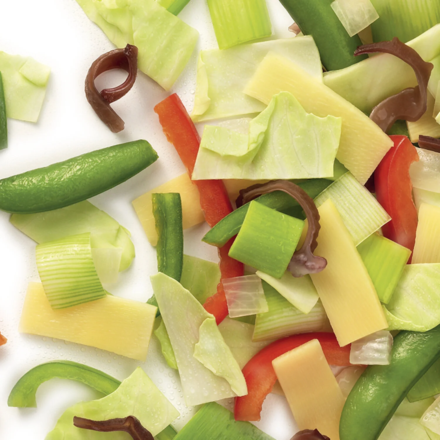 witte kool, bambooreepjes, Chinese champignons, gesneden prei, rode paprika reepjes, groene paprika reepjes, ajuinblokjes, suikererwten (in variabele proporties).