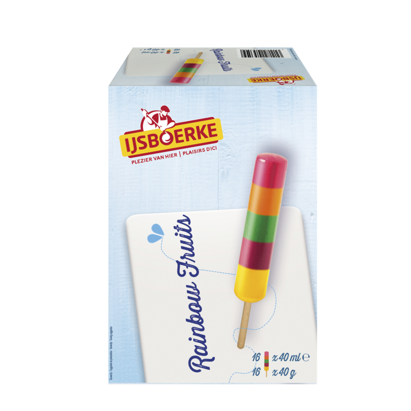 Rainbow fruits Kan je niet kiezen tussen al onze lekkere smaken? Dan is Rainbow fruits ideaal! Dit verfrissend waterijsje bestaat uit maar liefst vijf verschillende smaken: ananas, framboos, sinaasappel, citroen en appel.
