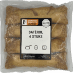 Water, tarwebloem, mechanisch gesepareerd kippenvlees 13%, pindakaas (pinda), zonnebloemolie, kippenei, paneermeel (tarwebloem, volkoren tarwemeel, zonnebloemolie, gist, zout), basterdsuiker (suiker, karamel, invertsuikerstroop), ketjap manis (melasse, suiker, aroma, sojasaus (sojabonen, tarwe), tarwezetmeel, zoethoutwortelextract), weipoeder (melk), zout, gemodificeerd zetmeel, ui, gelatine, rijsmiddelen: E450, E500, soja-eiwit, suiker, stabilisatoren: E450, E451, E341, aroma (tarwemelkei), sambal (rode pepers, zout), kleurstoffen: karamel, paprika-extract, satémix (zout, dextrose, specerijen, smaakversterkers: E621, E631, tarwezetmeel, bouillon, ui; soja), zetmeel, knoflookpoeder, voedingszuur: citroenzuur, smaakversterker: E635,